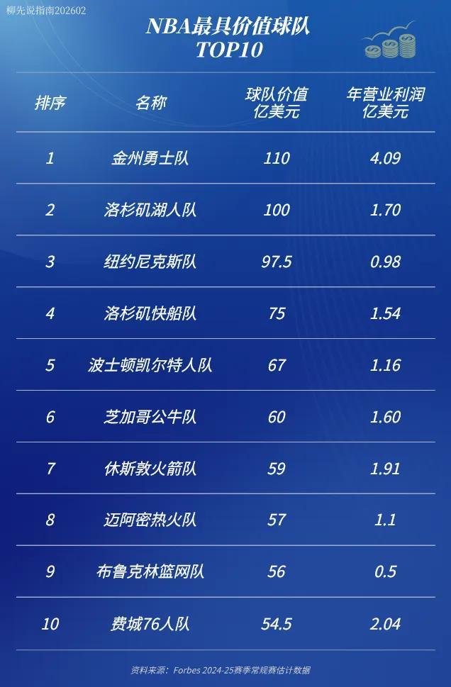 NBA球队年度赚钱王:球队估值110亿美元,年利润相当于两个湖人