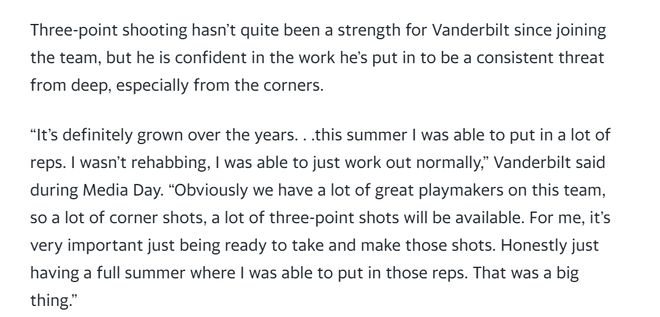 范德比尔特在这个夏天苦练了三分球。来到湖人后,三分球一直不是范德比尔特的长项,但是他相信自己夏天的努力会获得回报,相信自己在外线,尤其是底角会构成威胁。